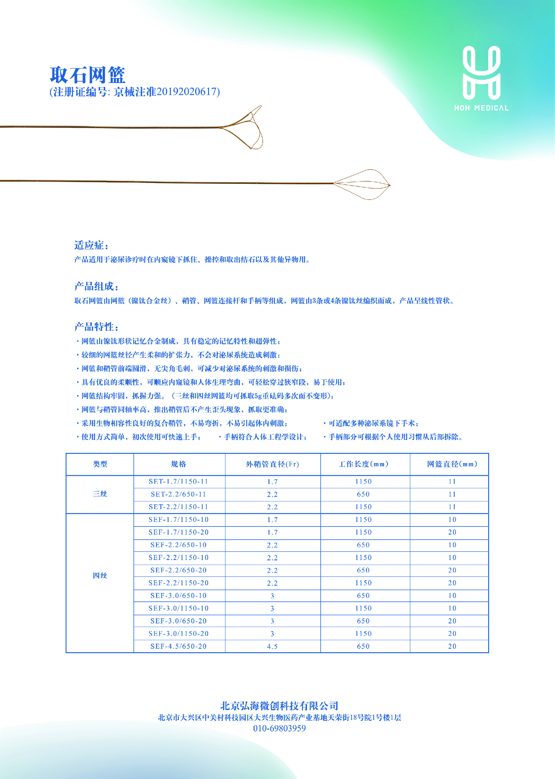 产品适用于泌尿诊疗时在内窥镜下抓住、操控和取出结石以及其他异物用。